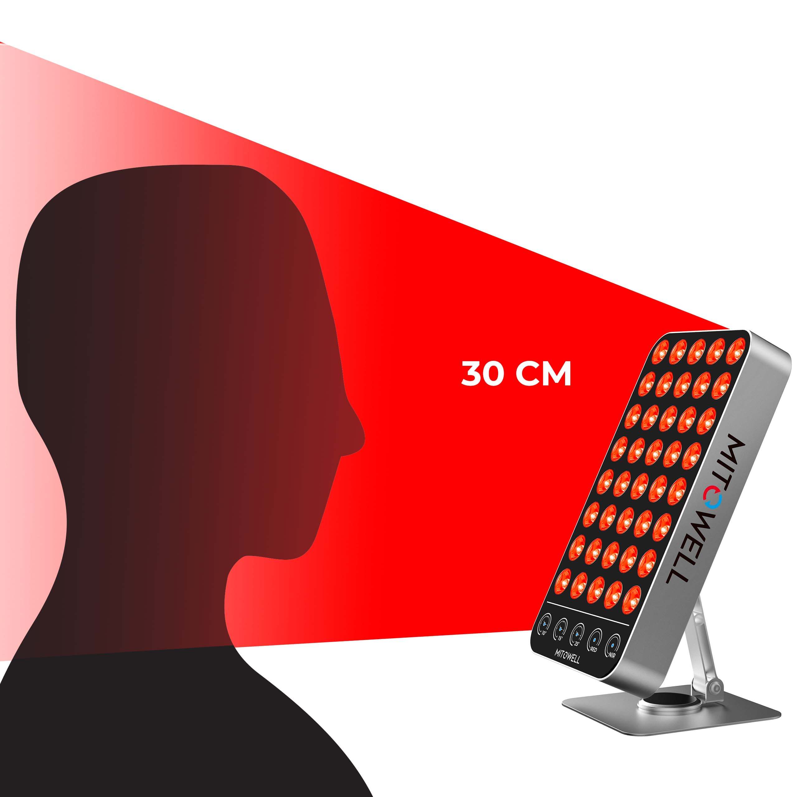 Kompaktowa powierzchnia świecenia (25×14 cm) w połączeniu z precyzyjnie dobraną soczewką z kątem 30° zapewnia skuteczne naświetlanie wybranego obszaru bez utraty efektywności terapeutycznej. Specjalnie zaprojektowana optyka gwarantuje równomierne rozprowadzenie światła na powierzchni ciała, zachowując optymalną moc emitowanego światła.